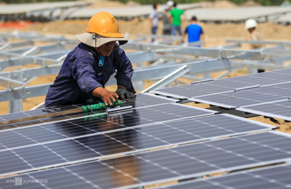Công nhân lắp đặt các tấm pin điện mặt trời tại một dự án ở Ninh Thuận, tháng 2/2019. Ảnh: Quỳnh Trần