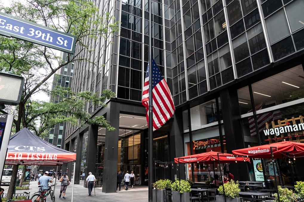 Mỹ treo cờ rủ tại trước tòa nhà số 695 Đại lộ 3 ở New York, nơi đặt trụ sở của phái bộ Nhật tại Liên Hợp Quốc ngày 8/7. Ảnh: Sipa.