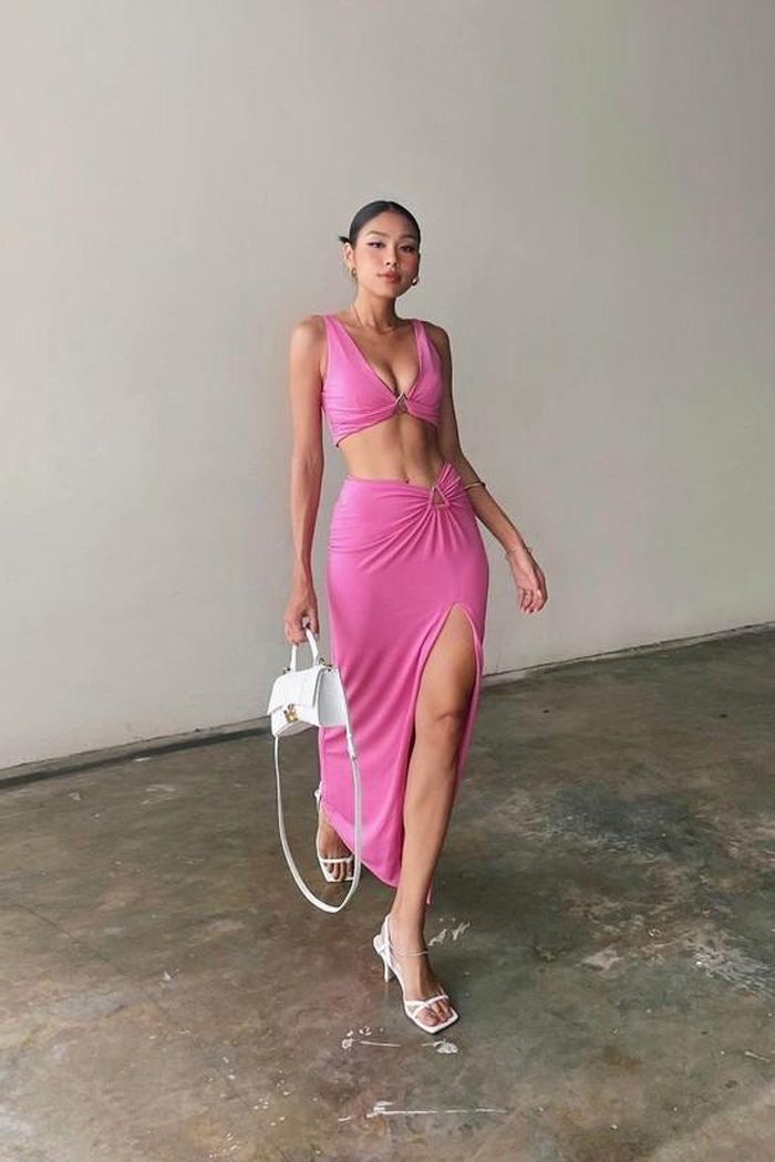 Diện trang phục hồng hợp trend, á hậu sử dụng túi xách có kiểu dáng và màu sắc đồng điệu cùng sandal hoàn thiện bộ trang phục dạo phố.