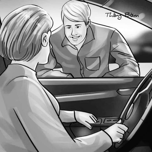 Người đàn ông nhìn thấy một chiếc xe Mercedes sang trọng nằm vắt vẻo bên lề đường, phía sau xe là một phụ nữ lớn tuổi đang loay hoay mở cốp. Trên con đường huơng lộ liên tỉnh vắng vẻ này, anh đoán rằng đã có chuyện với bà, nên bước tới hỏi thăm.