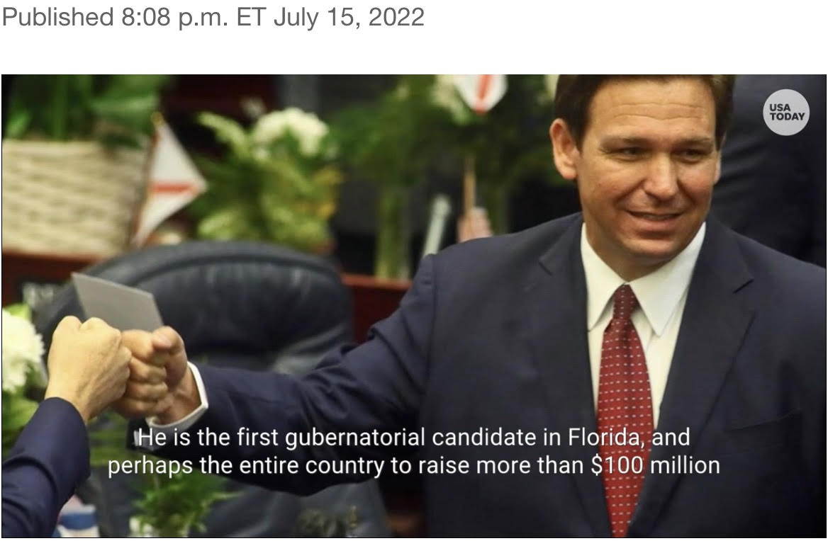 Bài viết này mục đích giúp bạn nhìn thấy cách truyền thông thổ tả đã đưa tin từ Florida theo kiểu bá đạo để có cớ ào ạt đem bão lớn bão nhỏ trút mưa trút gió vào Florida, nhằm đưa ông DeSantis lên đài như một người có tội với đất nước. Làm như Florida và ông thống đốc của họ chưa đủ bão để gồng. Ông DeSantis sinh ra và lớn lên ở Florida nên quen nếm mùi bão từ biển thổi vào. Từ nay, cuộc đời của ông sẽ nếm thêm mùi bão từ các kênh các đài thổi tới. Sau mỗi lần bão nổi ông DeSantis vẫn đứng vững được, là nhờ người dân của ông đã tin tưởng ông và tán thành những gì ông làm cho họ. Những nhà tài trợ bảo thủ cũng tán thưởng việc làm của ông, cho nên tổng số tiền ông DeSantis quyên được cho chiến dịch tái tranh cử tính đến nay đã lên hơn 100 triệu.