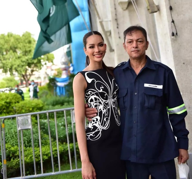 Bố của tân Hoa hậu Hoàn vũ Thái Lan 2022 vẫn mặc nguyên bộ đồ lao công khi xuất hiện trong sự kiện của con gái khiến các fan chú ý.