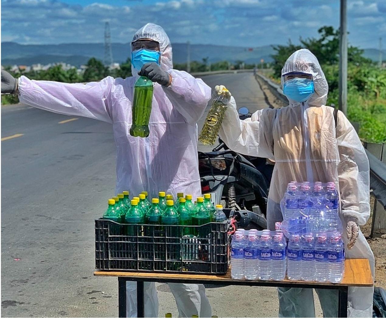 Vợ chồng anh Lành phát xăng cho đoàn người về quê tránh dịch năm 2021