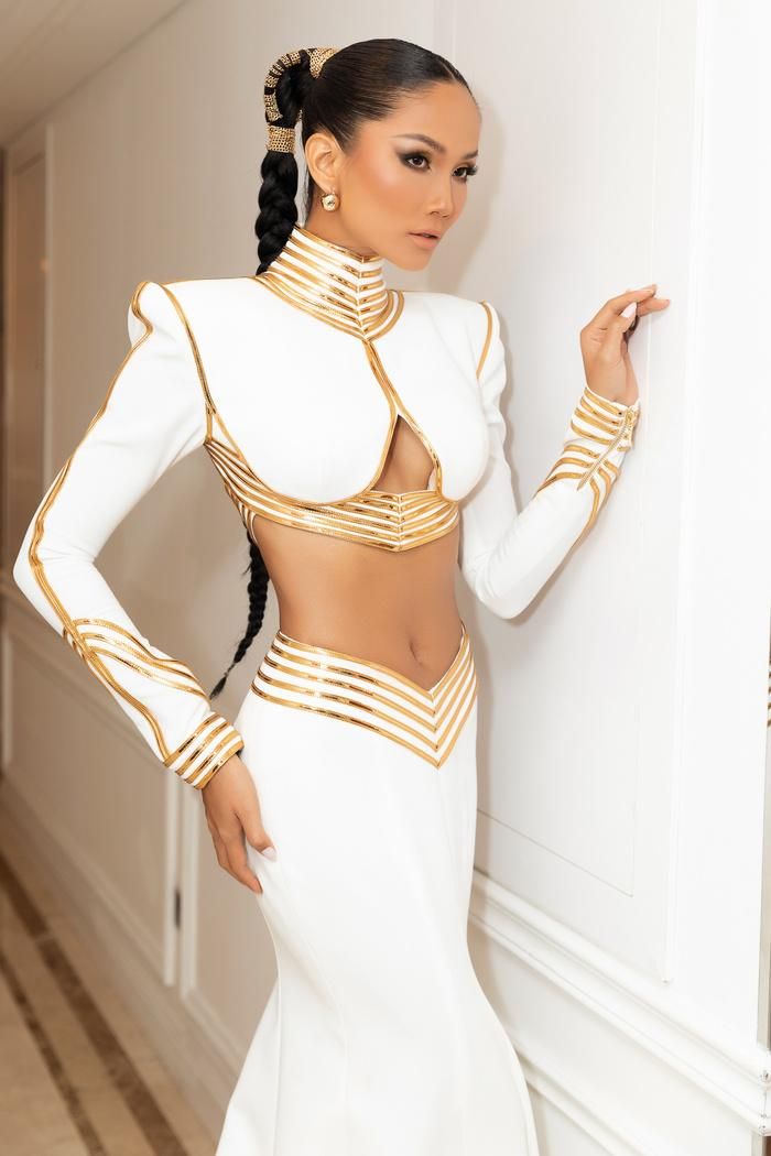 Đến với đêm chung kết, nàng hậu 9X sải bước tự tin trong bộ váy dạ hội có tông màu trắng và gold kết hợp những đường cut out tinh tế, chuẩn xác làm tôn lên mọi đường cong rực rỡ. Thiết kế còn làm tôn lên chiếc eo 59cm cùng tấm lưng trần nuột nà của H'Hen Niê bởi những khoảng hở hết sức tinh tế.