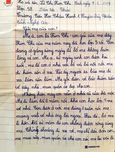 "Mẹ à, con là Kim Chi - con gái của mẹ đây. Kim Chi của mẹ năm nay đã học lớp 5 rồi. Con đang cố gắng từng ngày để bố mẹ không buồn lòng vì con. Mẹ ạ, từ ngày sinh con được hai tuổi, mẹ để con ở nhà với bố và bà nội rồi mẹ đi kiếm tiền ở xa. Lúc ấy, người ta bảo mẹ đi xa lắm tiền lắm