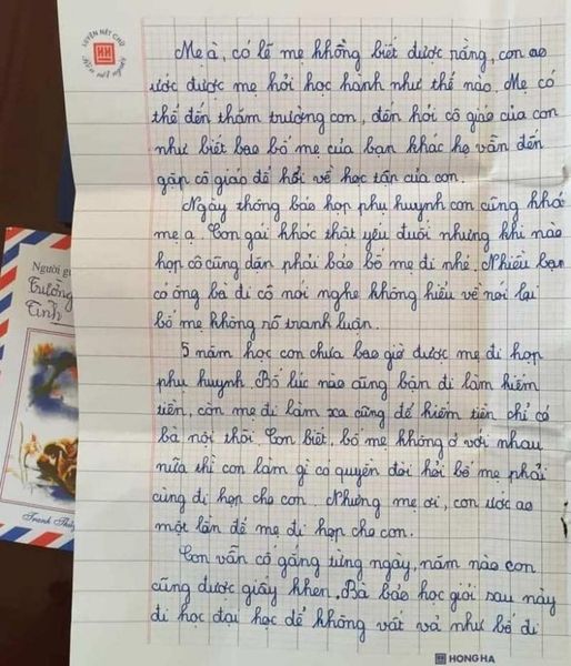 Mẹ à, có lẽ mẹ không biết được rằng con ao ước được mẹ hỏi học hành như thế nào. Mẹ có thể đến thăm trường con, đến hỏi cô giáo của con như biết bao bố mẹ của bạn khác họ vẫn đến gặp cô giáo để hỏi về học tập của con. Ngày thông báo họp phụ huynh con cũng khóc mẹ ạ. […].
