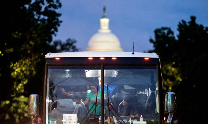 Những người nhập cư bất hợp pháp, lên chuyến xe buýt ở Texas, đã được thả xuống ở nơi có thể nhìn thấy từ tòa nhà Quốc hội Hoa Kỳ ở thủ đô Hoa Thịnh Đốn hôm 11/08/2022. (Ảnh: Stefani Reynolds/AFP qua Getty Images)