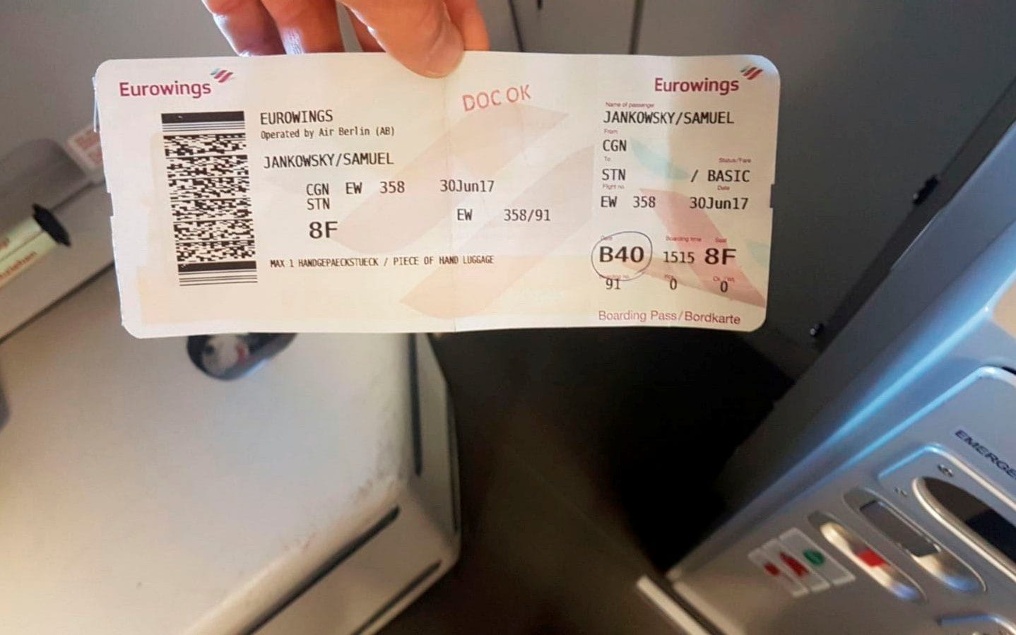 Samuel Jankowsky, 29 tuổi, chuẩn bị về Anh sau chuyến thăm Cologne, Đức thì phát hiện mình lâm vào tình cảnh trớ trêu, Telegraph đưa tin ngày 14.8.2017. Tiếp viên hàng không hãng Eurowings rà soát tới ba lần chiếc vé máy bay của anh ghi điểm đến là sân bay London Stansted, Anh vào ngày 30.6.2017.