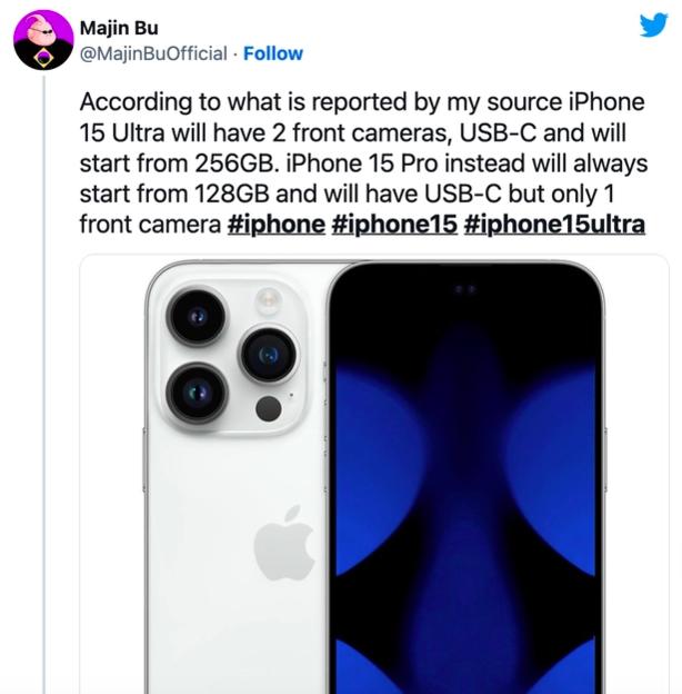 Trước đó, thông tin được LeaksApplePro tiết lộ trong một bài đăng trên Twitter rằng, Apple dự kiến sẽ thay đổi cách đặt tên cho mẫu iPhone cao cấp nhất ra mắt năm 2023. Theo đó, iPhone 15 Ultra sẽ thay thế cho "Pro Max", trong khi các phiên bản còn lại sẽ có tên gọi lần lượt là iPhone 15, iPhone 15 Plus và iPhone 15 Pro.