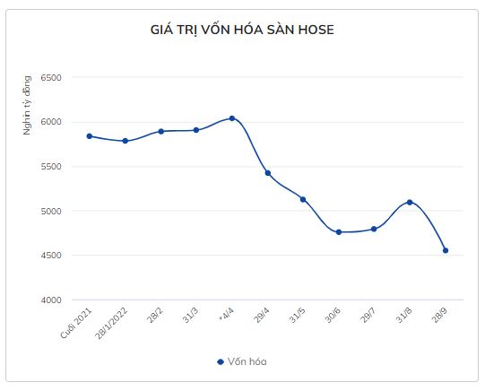 Giá trị vốn hóa của HoSE theo đó cũng bốc hơi nhanh chóng về dưới mốc 4,55 triệu tỷ đồng. Con số này thấp hơn 1,29 triệu tỷ đồng so với thời điểm đầu năm (gần 55 tỷ USD).