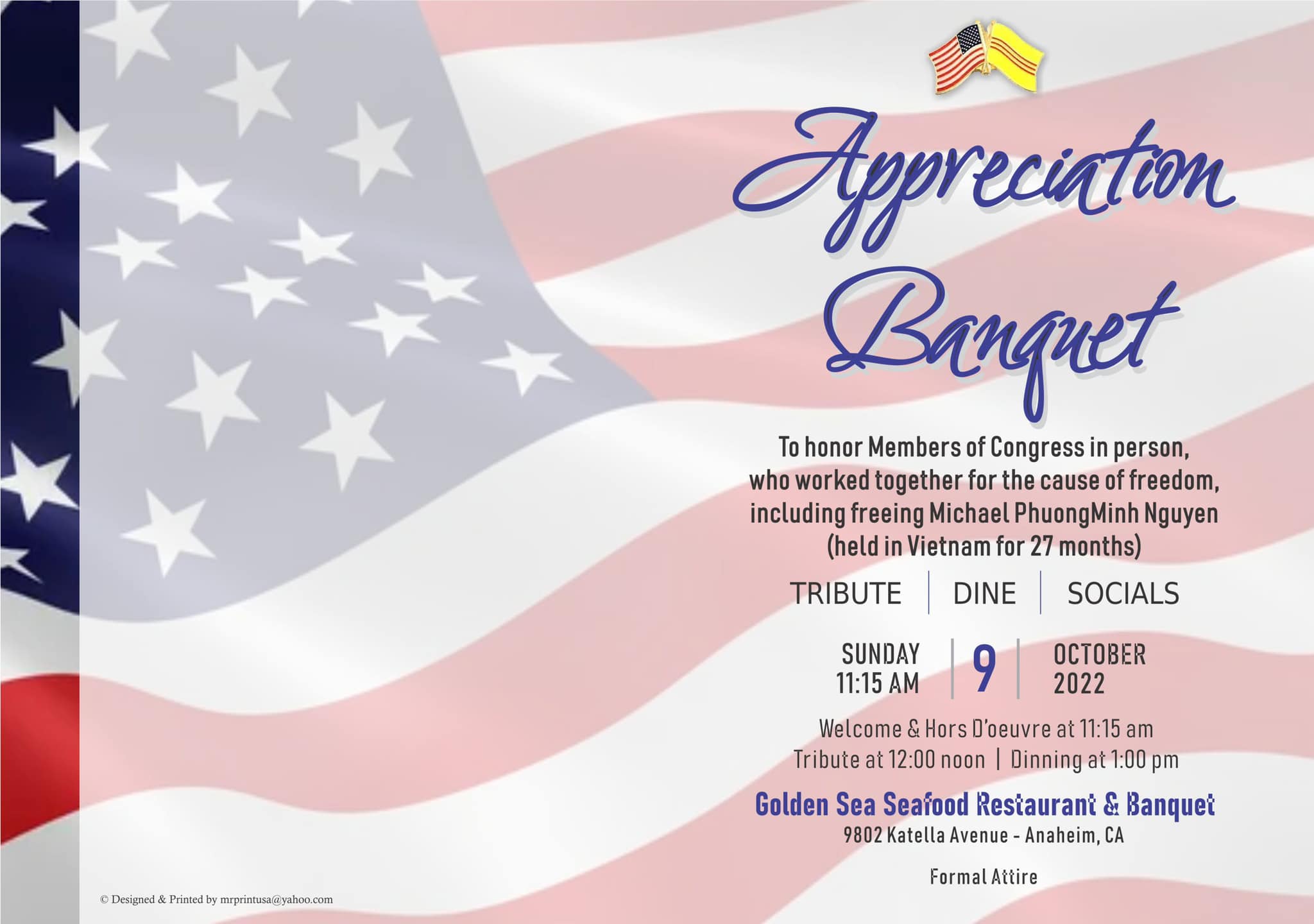 Theo thông cáo báo chí, ông Michael Phương Nguyễn sẽ tổ chức tiệc tri ân cho 8 thành viên Quốc Hội đã giúp ông được thả khỏi nhà tù cộng sản Việt Nam sau 27 tháng bị giam vì tội âm mưu lật đổ nhà cầm quyền cộng sản Việt Nam. Tất cả 8 vị dân biểu sẽ có mặt trực tiếp để tham gia buổi tiệc, hoặc tham gia qua liên kết video (đối với những người ở ngoài tiểu bang). Buổi tiệc diễn ra vào Chủ Nhật tuần này, ngày 9 tháng 10, vào lúc 11 giờ sáng cho đến 3 giờ 30 phút chiều, tại nhà hàng GOLDEN SEA SEAFOOD RESTAURANT & BANQUET, tọa lạc tại số 9802 Katella Ave., Anaheim, CA 92804. Ngoài sự có mặt đông đảo của các vị dân cử Hoa Kỳ, buổi tiệc còn có rất nhiều Thân Hào nhân sĩ, đặc biệt là giới truyền thông Việt Mỹ. Ông Michael Nguyễn chia sẻ rằng ông được trả tự do về với gia đình là nhờ nỗ lực và công sức của rất nhiều người, đặc biệt là các vị dân cử, nên gia đình ông muốn tổ chức tiệc tri ân này để cám ơn tất cả mọi người. Cũng trong dịp này ông hy vọng sẽ tạo được tình thân giữa các vị dân cử và cộng đồng người Mỹ gốc Việt. Nếu quý vị có mong muốn tham gia buổi tiệc, vui lòng liên lạc với ông Michael Phương Nguyễn theo số (714) 487-4022. Email: nguyenmpmn@gmail.com
