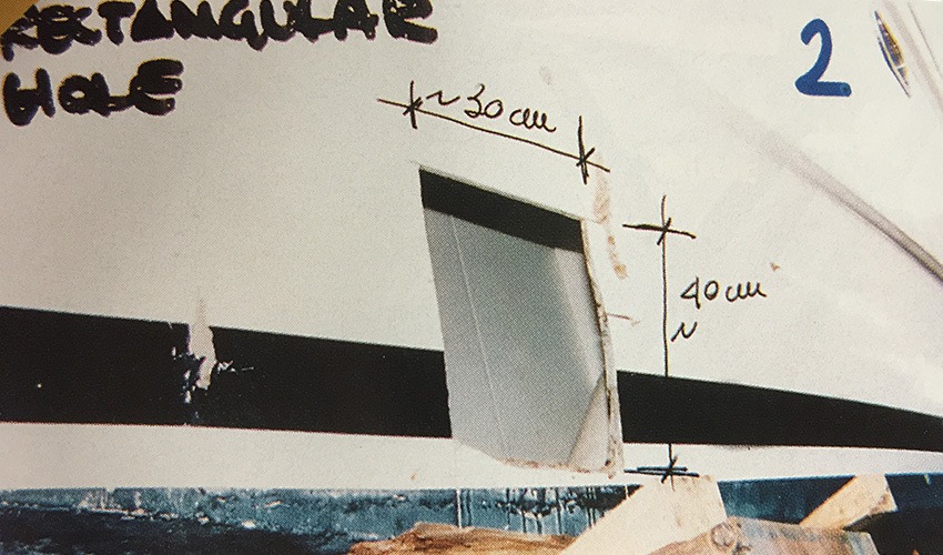 Bức ảnh được Văn phòng luật sư Mỹ sử dụng trong phiên tòa xét xử cho thấy lỗ hổng Rex gây ra cho du thuyền Principe di Pictor. Ảnh: Lamag