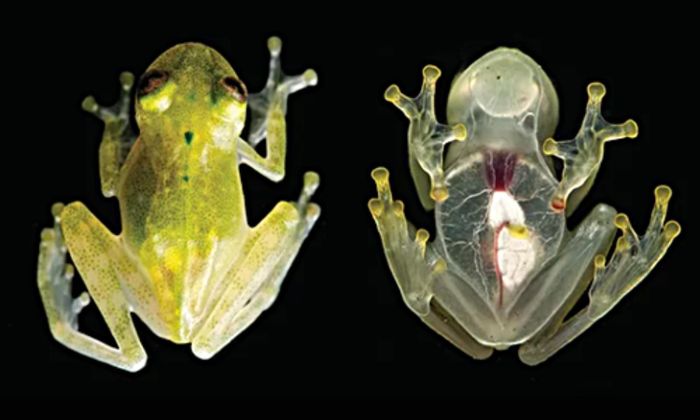 1. Ếch thủy tinh: loài vật trong suốt này có màu chung là xanh lá cây, trong khi đó các nội tạng bao gồm tim, gan, và đường tiêu hóa có thể nhìn thấy qua da. Chúng thường sống trên các lá cây ở vùng rừng núi trung tâm và phía nam nước Mỹ.