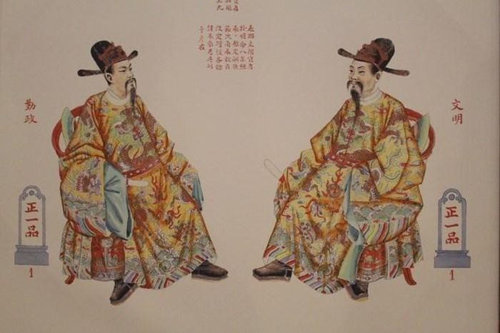Tranh minh họa: Tranh vẽ các vị quan Chánh nhất phẩm triều Nguyễn (Cần Chánh điện Đại học sĩ và Văn Minh điện Đại học sĩ) ngồi ghế. Tranh của họa sĩ Nguyễn Văn Nhàn đầu thế kỷ XX.