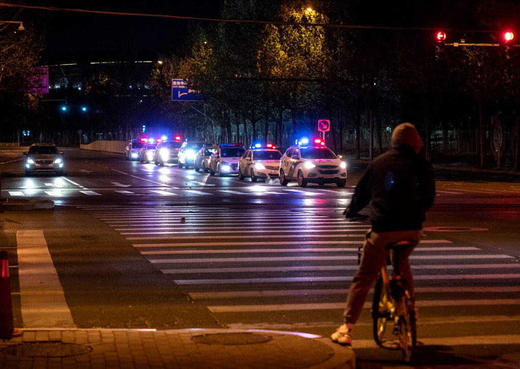 Cảnh sát ở Bắc Kinh canh chừng các giao lộ nơi có tin đồn sẽ diễn ra biểu tình vào tối 29/11/2022. (Ảnh: Kevin Frayer/Getty Images)
