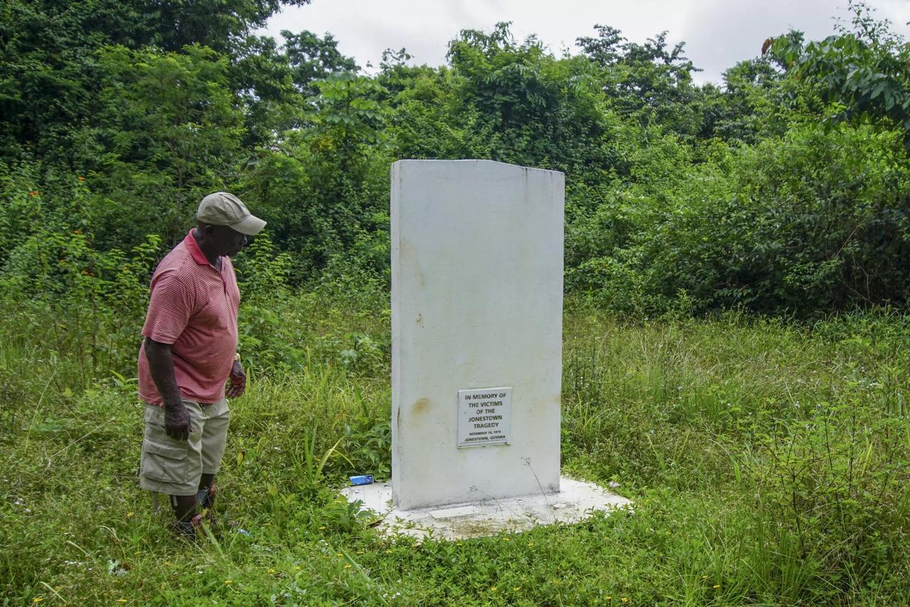 Fitz Duke, sống ở làng Port Kaituma gần Jonestown đứng trước một bia tưởng niệm các nạn nhân của vụ thảm sát rùng rợn Jonestown. Ảnh AFP