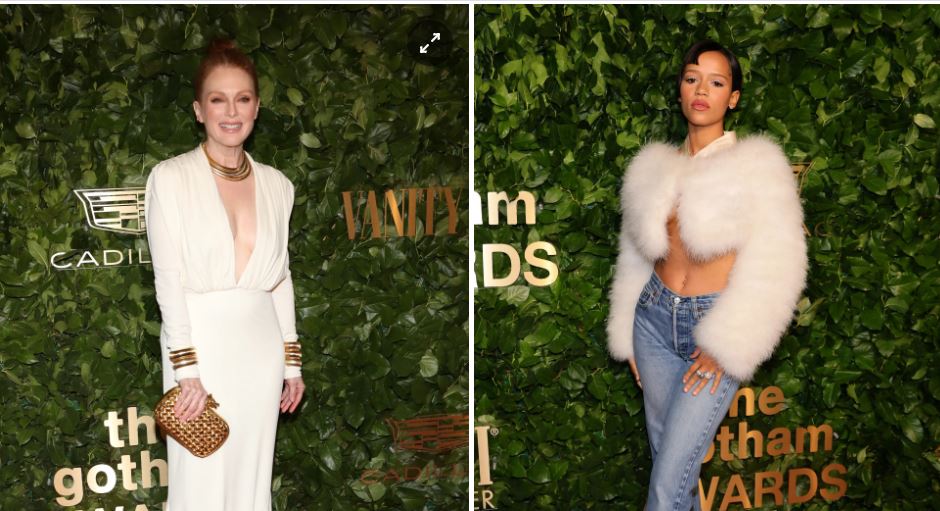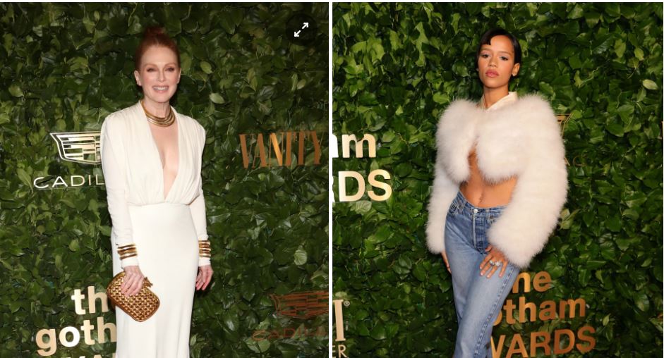Bên cạnh những thiết kế lấp lánh, váy áo gam trắng cũng trở thành item được ưa chuộng. Julianne Moore diện mẫu váy dáng dài từ Carolina Herrera. Trong khi đó, Taylor Russell mặc đồ vintage của Gucci. Ảnh: Vogue.