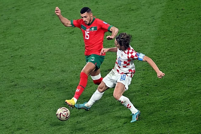 Amallah (trái) tranh bóng với Modric trong trận tranh HC đồng World Cup hôm 17/12, tại Qatar. Ảnh: EFE