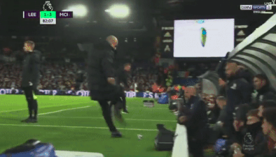Trên đường trở lại khu kỹ thuật, nhà cầm quân người Tây Ban Nha trút giận lên một chai nước. Tuy nhiên, cú đá của Pep lại đưa cái chai đi trúng một thành viên ban huấn luyện bên phía Leeds.