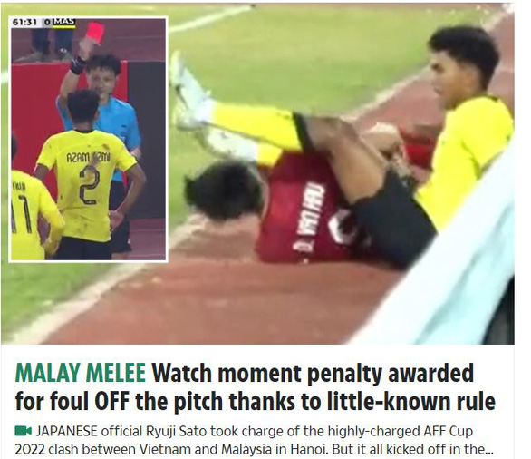Tình huống được hưởng phạt đền kỳ lạ của tuyển Việt Nam ở trận thắng Malaysia 3-0 tại AFF Cup 2022 đã trở thành 'hiện tượng' gây sốt và được báo chí thế giới quan tâm. Tờ The Sun (Anh) ca ngợi trọng tài Ryuji Sato có "quyết định tuyệt vời".
