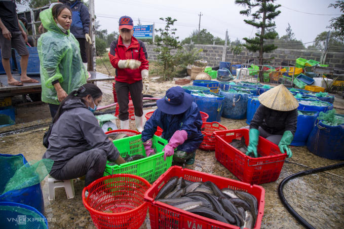 Từ 8h sáng, trang trại của ông Trần Kim Phi (47 tuổi, xă Ngư Thủy Bắc, huyện Lệ Thủy) tấp nập xe tải ra vào. Hàng chục người làm đang phân loại, cân và nhập cá gửi đi các tỉnh miền Trung và miền Bắc.