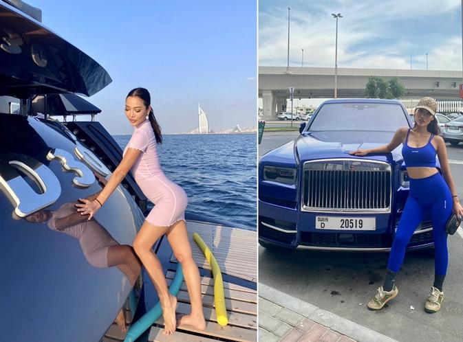 Trong dịp khác, Kiko Chan ngồi du thuyền 173 tỷ đồng để dạo phố và ngắm cảnh Dubai. Cô vẫn chuộng phong cách gợi cảm quen thuộc, tuy nhiên nàng hậu biết cách tiết chế để không bị phản cảm. Nhờ chế độ ăn uống, luyện tập hợp lý, Kiko Chan giữ được vóc dáng thon gọn.