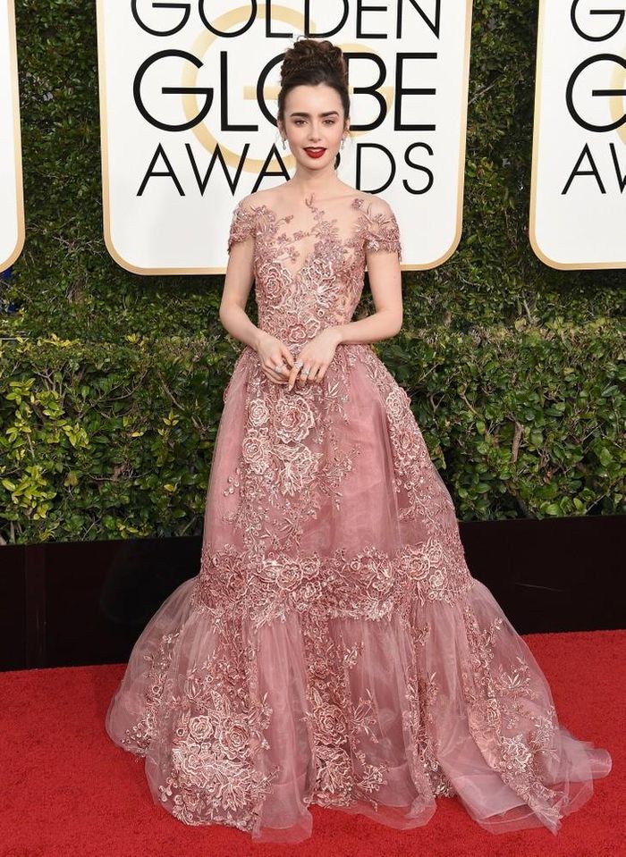 Lily Collins: Nữ diễn viên trẻ và xinh đẹp này xứng đáng là nàng công chúa trong truyện cổ tích khi diện chiếc váy hở lưng đầy tinh tế của nhà thiết kế Zuhair Murad tới Quả cầu vàng.