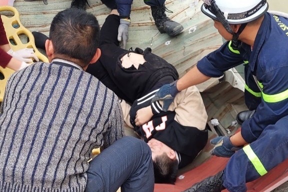 Một xe cứu nạn cứu hộ và 6 cảnh sát đã có mặt để đưa nạn nhân lên cáng cứng, nẹp cố định cổ đồng thời triển khai đội hình thang đưa người này từ tầng 2 xuống mặt đất.