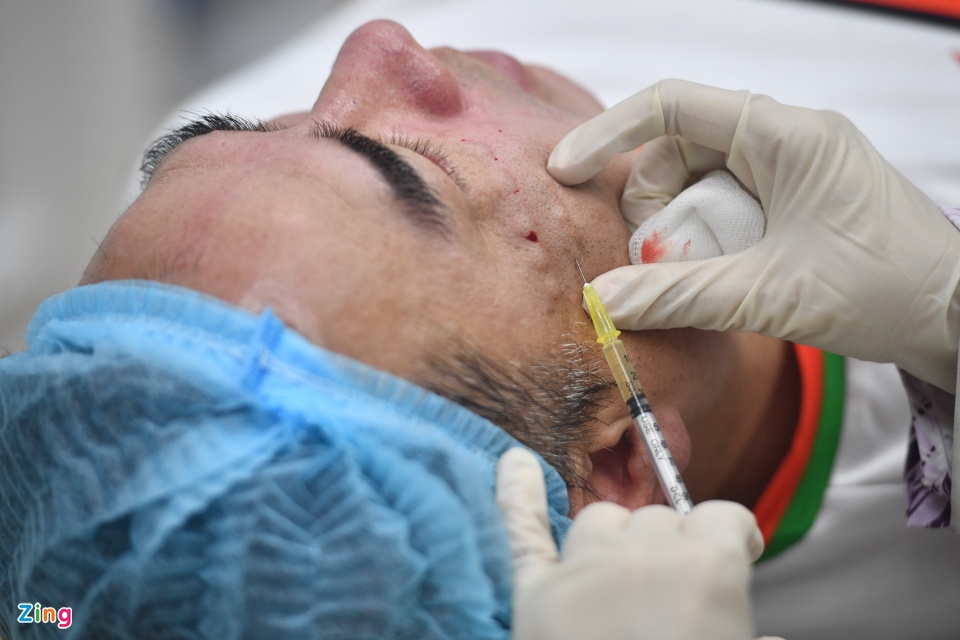 Bác sĩ Hiền ấn nhẹ đầu kim tiêm ngay thái dương, nhanh chóng bơm toàn bộ chất lỏng vào bên trong. Ông Dũng khẽ nheo mắt v́ đau rát. Thao tác này lặp lại hơn chục lần, đến khi toàn bộ 2 bên má người đàn ông hiện rơ dấu vết kim tiêm.
