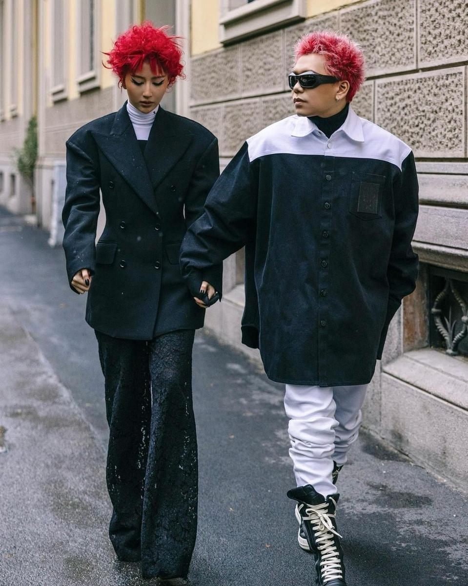 Fashionista 26 tuổi và bạn trai diện trang phục đồng điệu. Mùa này, cả 2 xuất hiện tại Milan Fashion Week với kiểu đầu đỏ rực, nổi bật. Trong khi đó, trang phục của họ có màu sắc trung tính, phom dáng trẻ trung. Ảnh: quynhanhshyn_.