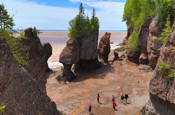Khách du lịch đi dạo trên bãi biển khi thủy triều xuống tại Hopewell Rocks ở New Brunswick, Canada. Bờ biển nằm trên Vịnh Fundy, nơi có thủy triều cao nhất thế giới, khi nước rút có thể tìm thấy hóa thạch.