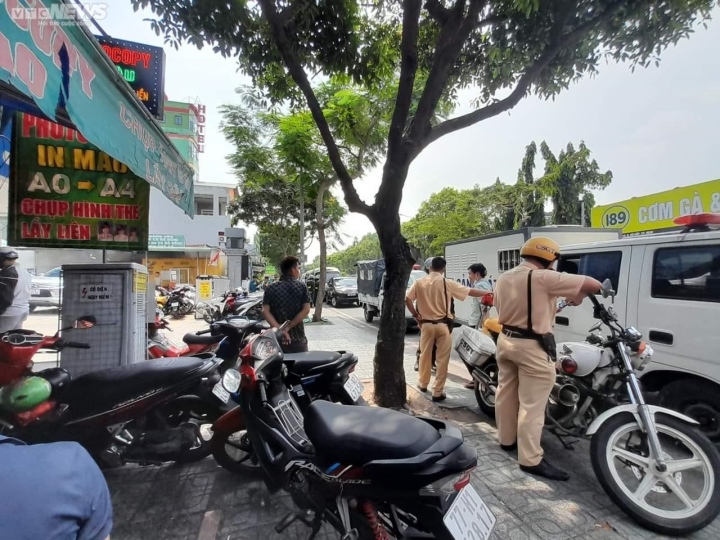 Lực lượng CSGT có mặt trước toà nhà đặt trụ sở Công ty F88. (Ảnh: Hoàng Thọ)
