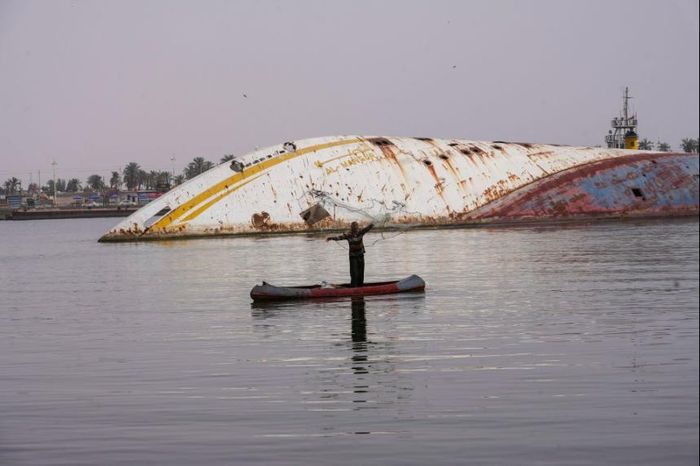 Một ngư dân Iraq quăng lưới gần chiếc du thuyền lật nghiêng. (Ảnh: Reuters)