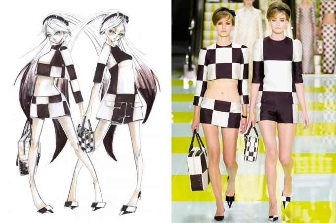 Hatsune Miku làm mẫu cho thiết kế của Louis Vuitton (trái) và người mẫu trên sàn runway. Ảnh: Pyxis