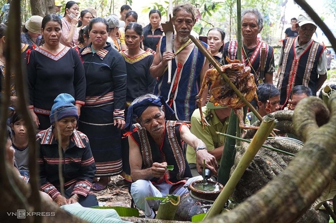Ngày 25/3, người dân làng O Grang và De Chí mang nếp, thịt, ghè rượu vào cánh rừng cách nơi ở khoảng một km để thực hiện nghi lễ. Chính quyền và lực lượng kiểm lâm cũng có mặt, tham gia lễ tạ ơn thần rừng.