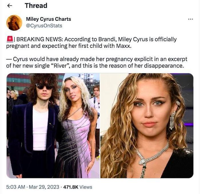 Ngày 29/3, một tài khoản Twitter ủng hộ Miley Cyrus bất ngờ lan truyền thông tin nữ ca sĩ đang mang thai con đầu ḷng với bạn trai kém 6 tuổi - tay trống Maxx Morando. Cả hai đang trông chờ ngày em bé ra đời.
