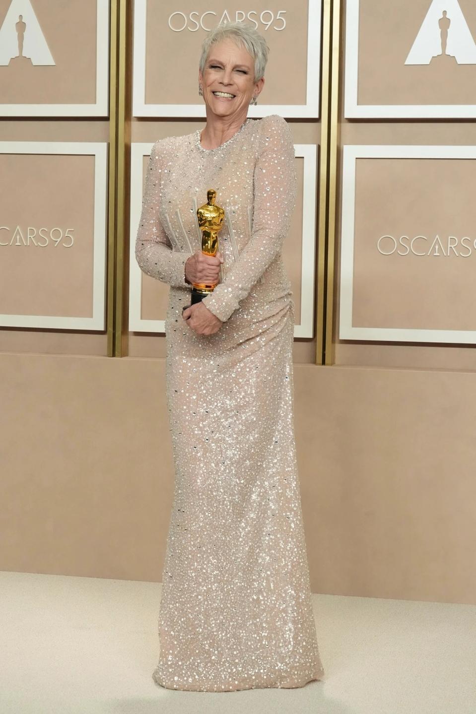 Ngoài các mẫu váy cưới gợi cảm, nhiều thiết kế đơn giản nhưng thanh lịch được ngôi sao lựa chọn. Emily Blunt diện mẫu đầm từ Valentino. Thiết kế mang phong cách cổ điển, tôn lên vóc dáng người mặc. Trong thiết kế của Dolce & Gabbana, Jamie Lee Curtis thể hiện vẻ quý phái. Chiếc váy lấp lánh có chi tiết corset ở phần eo. Ảnh: DPA, AP.