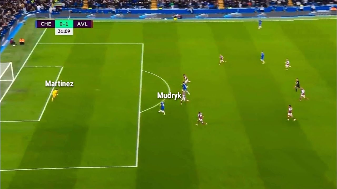 Phút 6, Mudryk cướp bóng sát vòng cấm rồi dứt điểm không thắng được Emiliano Martinez trong thế đối mặt. Phút 31, anh đón đường chọc khe của Mateo Kovacic, xâm nhập vòng cấm nhưng đặt lòng như chuyền đến đúng vị trí của thủ thành Aston Villa. Đây là trận thứ tám liên tiếp Mudryk không ghi bàn, gồm bảy trận tại Ngoại hạng Anh và một ở Champions League.