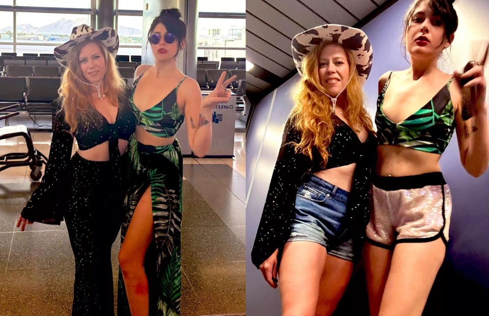 Chrissie Mayr (trái) và Keanu Thompson được yêu cầu thay quần trước khi lên chuyến bay của American Airlines. Ảnh: Chrissie Mayr.