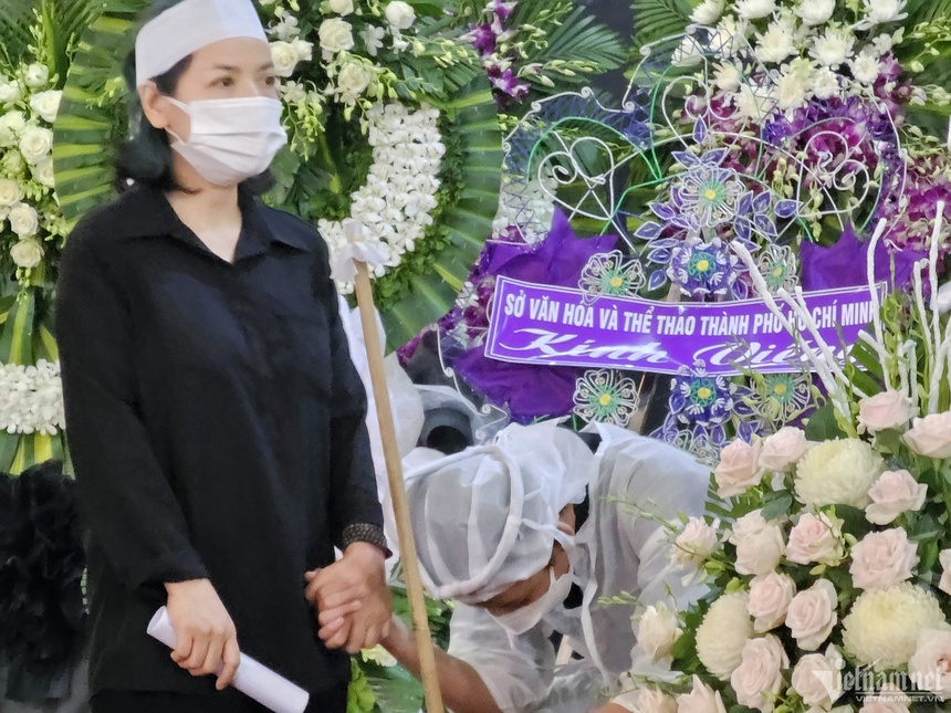 Em Chí Nam - con trai NSƯT Hồng Vy bên linh cữu mẹ.
