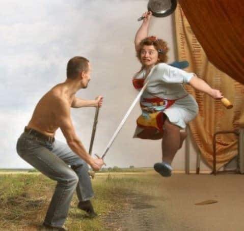 Bà vợ sợ xanh mặt, hoảng loạn hét lên: - Bớ người ta, cứu, cứu, chồng tôi điên rồi, ngáo đá rồi...