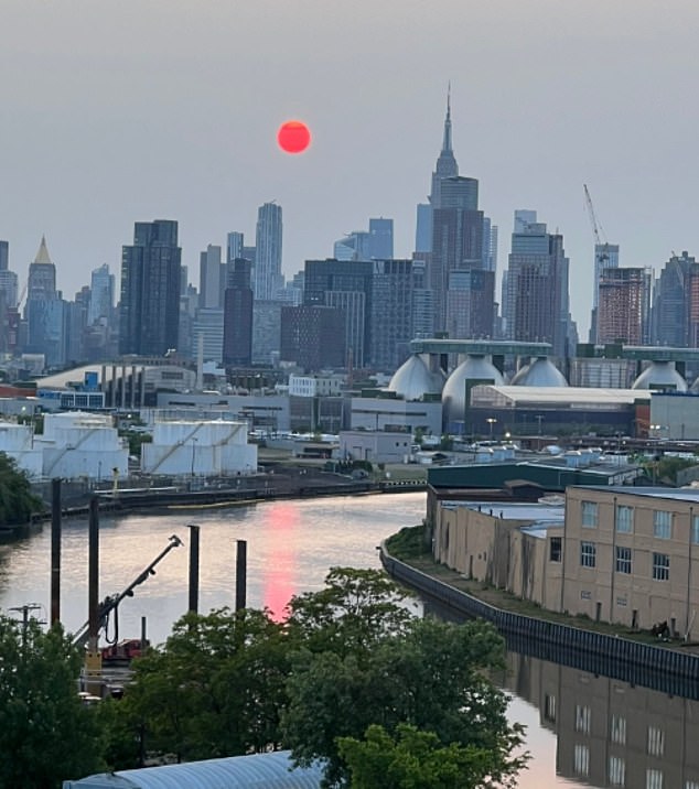 Màu đỏ rực là do khói lọc các bước sóng ánh sáng ngắn, chỉ cho phép các bước sóng màu đỏ và cam đi qua. Nắng trong ngày ở Mỹ cũng cũng mờ hơn vì khói dày đặc từ Canada.