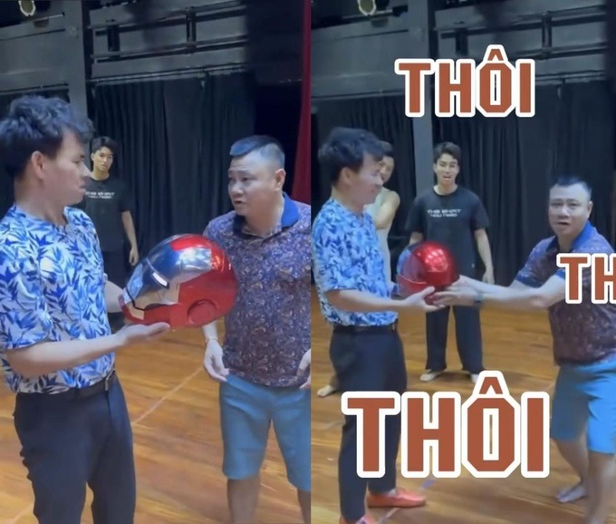 Đoạn clip tiết lộ hậu trường một buổi tập luyện của 2 nghệ sĩ cho dịp Quốc tế thiếu nhi 1/6 sắp tới. Trong khi NSƯT Xuân Bắc đang chăm chú tập luyện và hướng dẫn cho các diễn viên khác những động tác biểu diễn thì NSND Tự Long lại trốn vào một góc với chiếc mũ của Người Sắt.