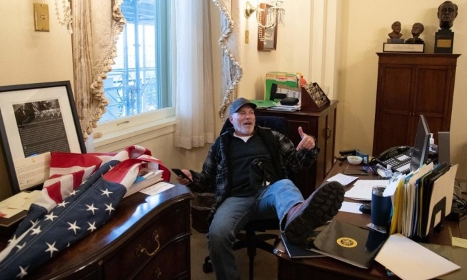 Richard Barnett gác chân lên bàn làm việc của bà Pelosi trong bạo loạn Đồi Capitol hồi tháng 1/2021. Ảnh: AFP
