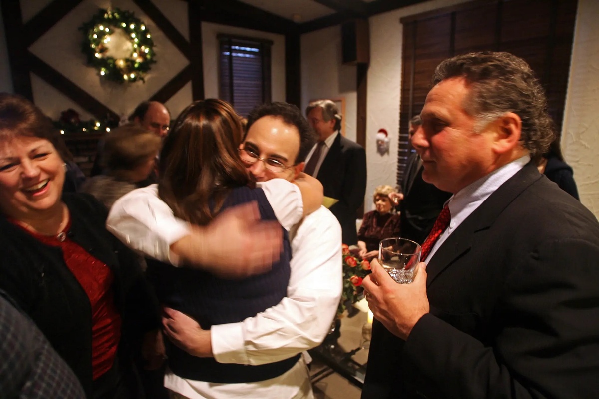Ông Salpeter (phải) và ông Tankleff (áo trắng) trong bữa tiệc mừng ông Tankleff trở về từ nhà tù. Ảnh: New York Times.