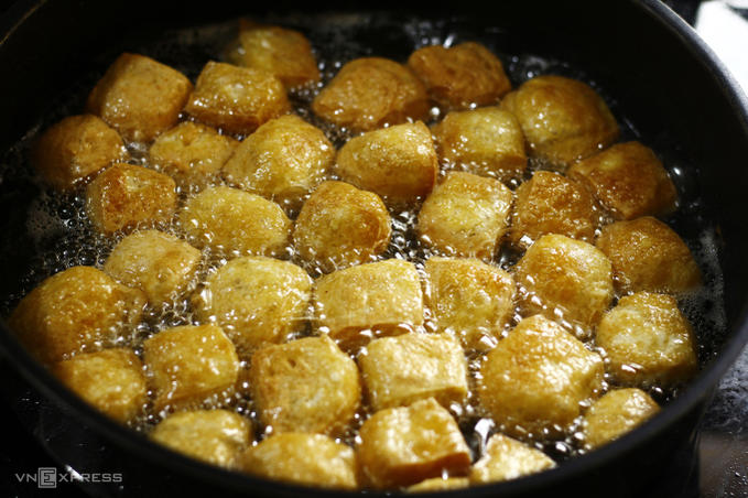 Sau khi cho mỡ lợn vào chờ mỡ nóng, thử bằng cách dùng đầu đũa thăm dò nếu thấy sủi tăm to là đã đạt độ nóng. Lần lượt cho đậu phụ vào, chừa ra các khoảng cách để đậu không bị dính vào nhau. Hạ lửa vừa để rán đậu. Canh lửa rất quan trọng, không nên để lửa to quá làm cháy đậu, mà lửa non quá đậu lại ỉu, không giòn xốp.