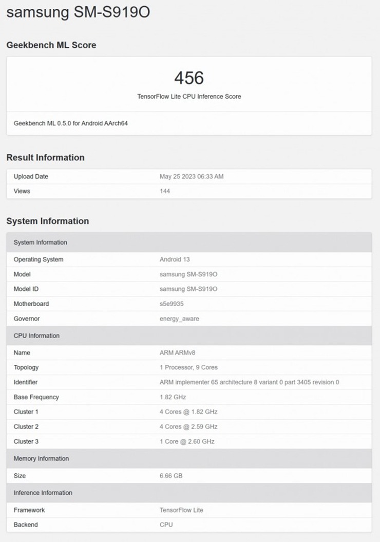 Giờ đây, phép thử Geekbench mới nhất cho thấy một thiết bị bí ẩn của Samsung dường như đi kèm chip Exynos 2300 này. Điều đó được chứng minh khi mẫu sản phẩm có tên model SM-S919O được trang bị chip 1+4+4. Mặc dù xung nhịp CPU được báo cáo không khớp với xung nhịp dự kiến nhưng điều đó khá bình thường với phần cứng tiền sản xuất.
