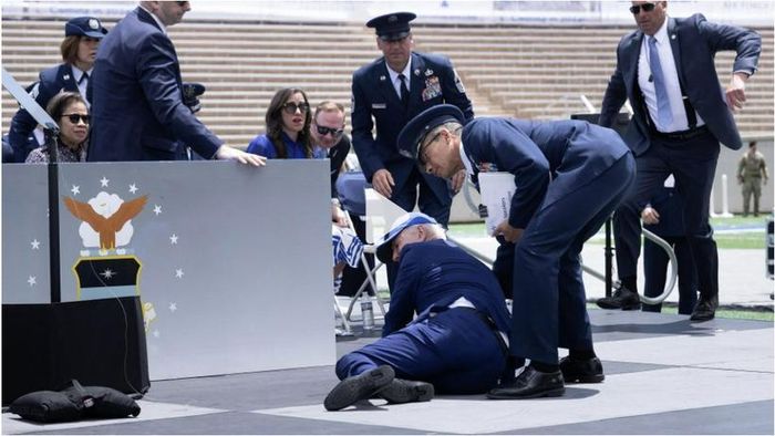 Phía nhà Trắng cho biết: Tổng thống vẫn ổn sau cú ngã. Cú vấp ngã bắt đầu khi ông Biden đi ra khỏi sân khấu trung tâm, nơi ông có bài phát biểu trước các sinh viên tốt nghiệp của học viện trước đó.