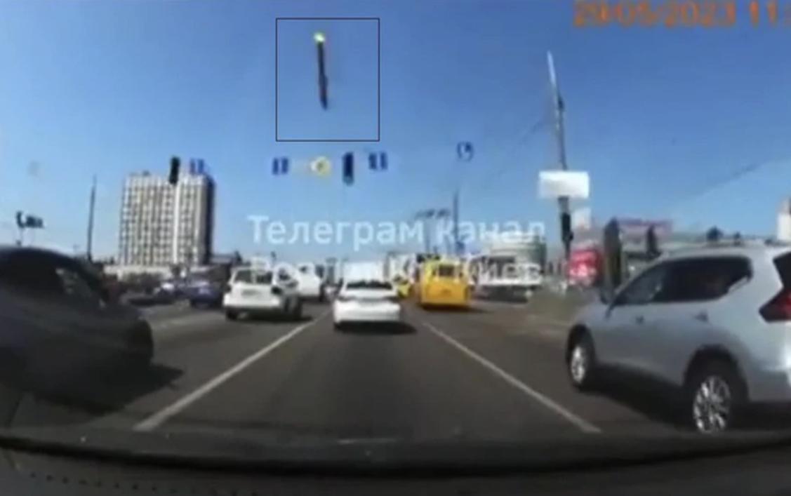 Cụ thể, quả đạn tên lửa từ trên cao bất ngờ lao thẳng xuống, quệt vào đèn tín hiệu giao thông và rơi xuống khoảng trống giữa hai làn xe.