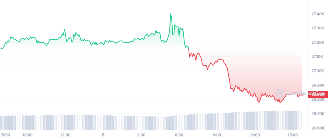 Theo dữ liệu của CoinMarketCap, trong vòng 24 giờ qua, giá Bitcoin đã giảm 1,44% xuống 26.765,46 USD/BTC. Nguy cơ vỡ nợ của Mỹ không còn rình rập các thị trường, nhưng Bitcoin đang đối mặt với một rào cản mới.